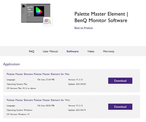 BenQ dodává vlastní software pro kalibraci monitoru Palette Master Element. Podporovány jsou sondy i1 Display PRO, i1 Display 2, i1 PRO, i1 PRO 2, Spyder 4 a Spyder 5.